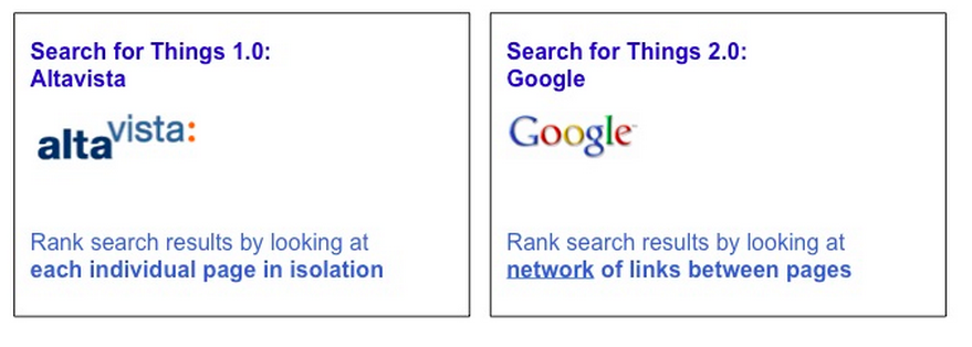 But in the new web (“Internet 2.0”) all of the above is now done via network effects. eBay uses a network of reviews, PayPal assess fraud through a network of transactions, and Google ranks pages through a network of links.